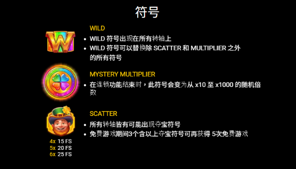 本作符號設計以財富與幸運元素為主軸,盤面中包含多種高低價值符號,從幸運馬蹄鐵、啤酒杯、菸斗與金幣袋等高價值圖示,到各種寶石與水滴形圖案的基本符號,形成清楚的賠付層級。當版面出現足夠數量相同符號時即可形成得獎組合,而高價值符號在大量出現時往往能帶來更顯著的回報,除了基本符號外,遊戲中還設有萬用的WILD符號,能替代除散射符號與乘數符號以外的大多數圖示,使得中獎組合更容易形成,並在關鍵時刻提升整體盤面的得獎機會。