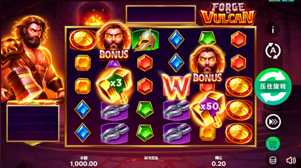 實際試玩《火神伏爾甘》後,能明顯感受到遊戲在節奏與張力設計相當鮮明。盤面整體採用鍛造與熔岩主題,視覺效果帶有強烈的火焰能量感,每次符號崩落時都伴隨炙熱的動畫效果,使連鎖得獎過程看起來更具衝擊力。遊戲在符號分布也維持良好的平衡,高價值武器與鍛造工具圖示雖出現頻率不高,但只要一次形成大量組合,獎金回報就會明顯提升,而寶石符號則負責維持盤面的流動性,使得連鎖得獎出現的頻率相對穩定,整體體驗偏向節奏持續推進型。