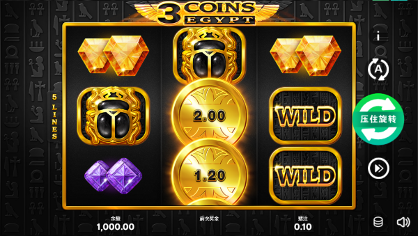 介面有著濃厚的古埃及神殿風格,3×3輪軸被金色邊框完整包覆,視覺焦點自然集中在中央第2轉軸,醒目的堆疊式金幣符號,搭配聖甲蟲圖騰、寶石符號與深色石刻背景,整體呈現出沉穩而不花俏的質感。WILD符號以黑金配色呈現,在盤面中辨識度極高,讓玩家能迅速判斷連線可能性,整體透過清楚的符號比例與對稱配置,營造出「獎金正在版面中慢慢堆疊」的直觀感受。