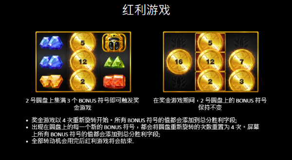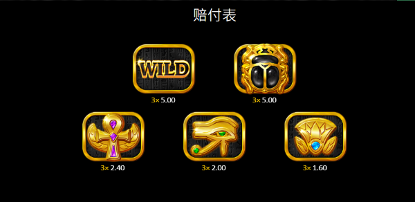 本作符號設計以「寶藏價值層級」作為清楚區分,高價值符號包含金色聖甲蟲、神祇徽章與護符圖騰,負責撐起主遊戲的主要派彩表現;中低價值符號則以各色寶石為主,讓盤面在一般轉動時保持穩定的中獎節奏。WILD符號可出現在所有轉軸,並可替代除BONUS以外的所有符號,是主遊戲中促成連線的重要輔助角色,能有效提高賠付線成立的機率,讓整體玩法不至於過於乾澀。