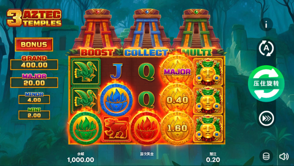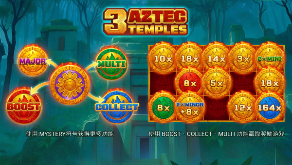 整體而言,《阿茲特克三神殿》是一款結構清晰、符號意義鮮明、爆發點集中在BONUS與功能符號放大效果的作品。試玩過程中最吸引人的,是BOOST、COLLECT、MULTI等機制帶來的獎金堆疊感,讓紅利回合不只是單次結算,而是有機會逐步推升、越轉越有期待。如果你偏好回合快速、紅利爆發感強的老虎機題材,在鉅城娛樂城這類平台上遊玩時,無論是先試玩熟悉符號特性,或直接投入獎勵階段感受神殿能量爆發的爽感,都能更完整體驗這款叢林寶藏系作品的魅力。