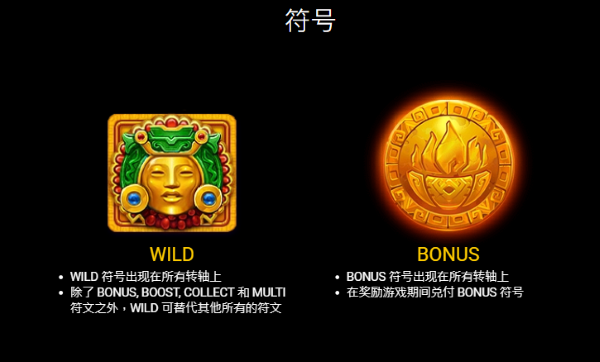 此外遊戲設有WILD與BONUS兩大特殊符號,雙雙皆可出現在所有轉軸上,前者能替代除BONUS與特殊功能符號以外的所有符號,提升連線彈性,後者則可於獎勵遊戲期間作為主要計分符號。更具爆發性的神秘符號(MYSTERY)機制,僅在獎勵階段出現,並可能轉化為BOOST、COLLECT不等獎金符號,BOOST會為所有符號增加額外價值,COLLECT可一次性收集盤面硬幣總值,而MULTI則將符號數值進行倍數放大,各種符號以紅、藍、綠區分,象徵神殿能量的不同加持。