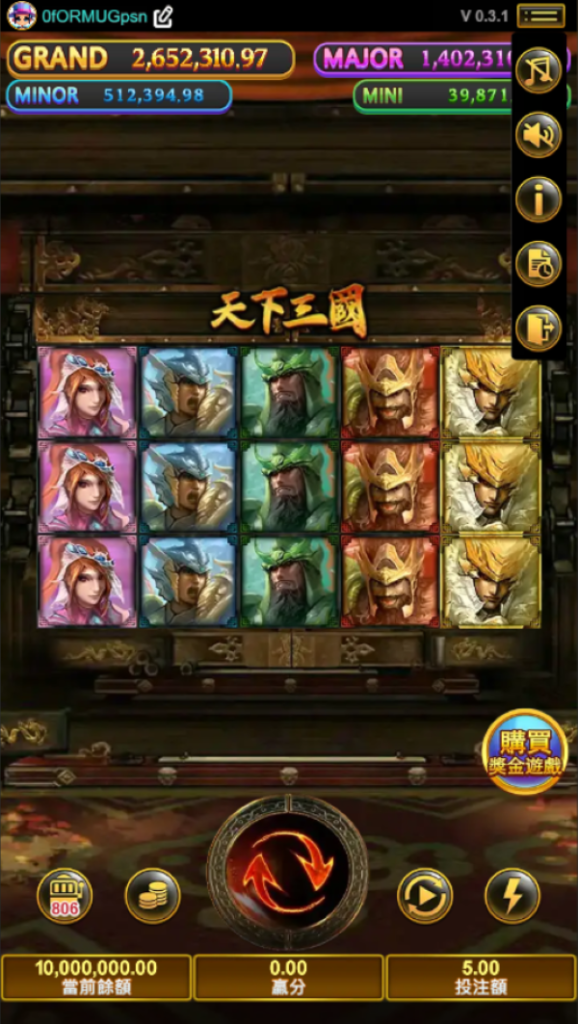 在老虎機題材中,三國向來象徵權謀與耐心,《天下三國》正是以這樣的精神為核心打造。遊戲結合歷史武將形象與戰場氛圍,搭配熟悉的 5×3 盤面結構,操作直覺卻不流於單調。多層獎勵與延伸機制藏於轉輪之中,讓每一次旋轉都更像是在佈局戰局,而非單純等待結果。