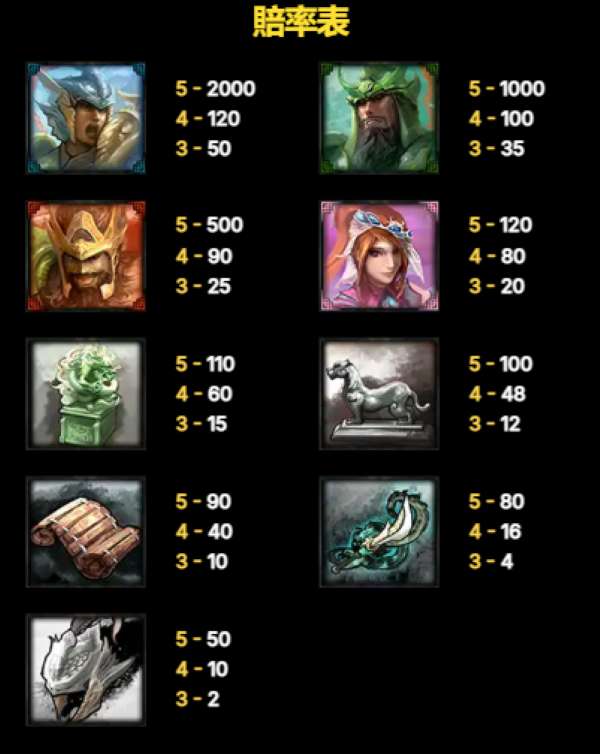這款遊戲以熱血三國題材為背景,將戰略佈局的概念巧妙融入老虎機玩法之中。全盤採用20條固定賠付線,所有得獎判定需從最左側轉輪開始,只要相同符號由左至右在指定路徑上連續出現,即可成立中獎,每條賠付線僅計算該線上的最高獎金組合,讓盤面判定清楚直觀。